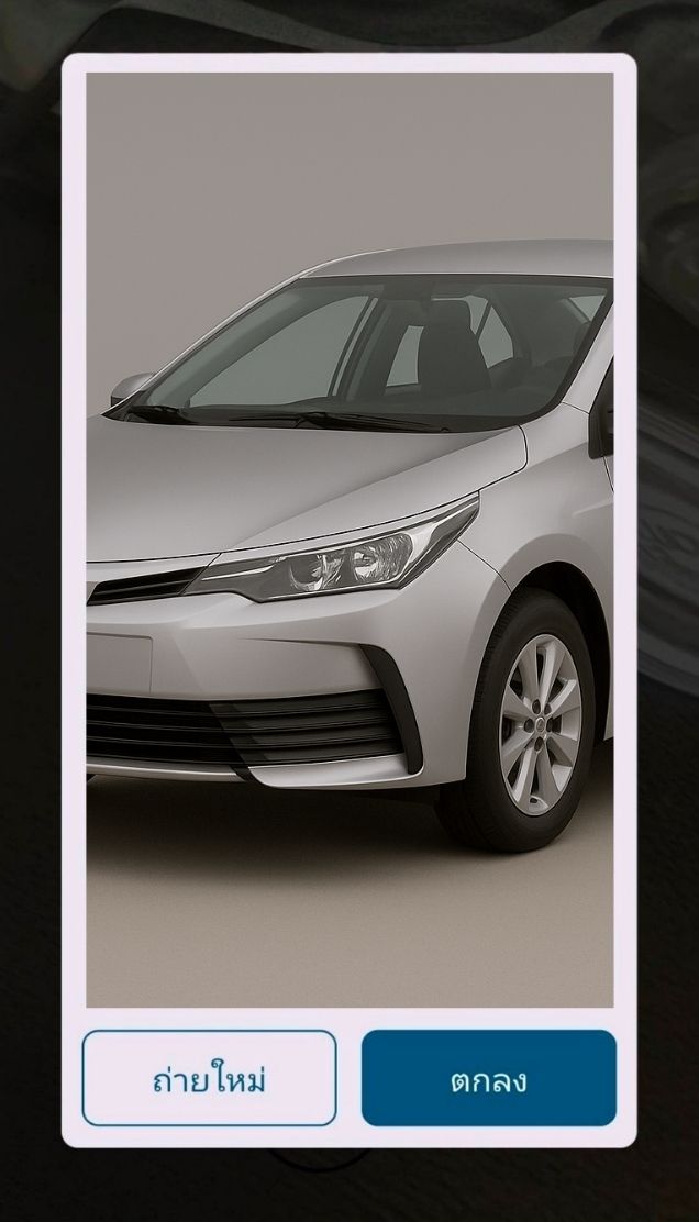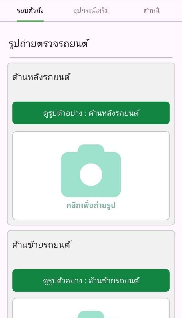 แอปจะแสดงกรอบและตัวอย่างมุมอัตโนมัติ เช่น ด้านหน้า/หลัง/ซ้าย/ขวา ภายใน เลขไมล์ และตำหนิที่พบ เพื่อความครบถ้วนตามเกณฑ์ของบริษัทประกัน